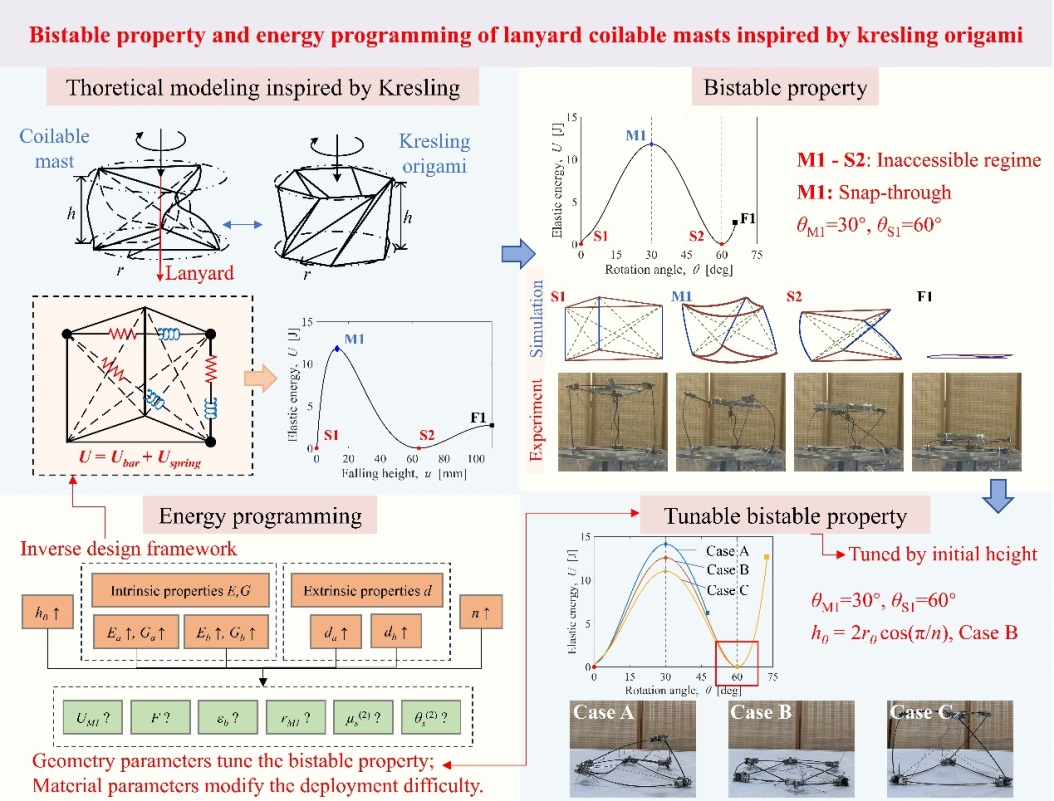 该研究成果以Bistable property and energy programming of lanyard coilable masts inspired by Kresling origami为题发表于International Journal of Mechanical Sciences。沈阳自动化所博士研究生唐莹莹为第一作者,刘金国研究员为通讯作者。该研究工作得到了国家重点研发计划等相关项目的支持。(空间自动化技术研究室)